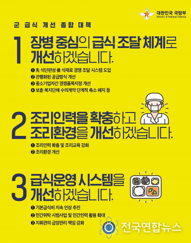 이번 대책은 △장병 중심의 급식조달체계 개선 △조리인력 확충 및 조리환경 개선 △급식운영 시스템 개선 등에 중점을 두고 마련됐습니다.