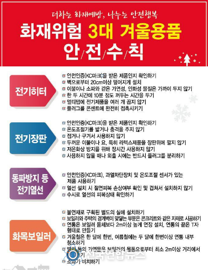 이진규 대응예방과장은 “겨울철 난방용품은 우리 생활을 안락하게 해주는 필수 생활용품이지만 그에 따른 각별한 주의가 필요하다.”며 “난방용품을 사용할 때는 안전 수칙을 준수해 안전하고 따뜻한 겨울을 보내시기 바란다.”고 전했다.