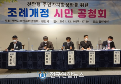전국연합뉴스 노윤호 기자 | 천안시와 천안시주민자치연합회는 지난 16일 웨딩베리에서 ‘천안형 주민자치활성화를 위한 조례개정 시민공청회’를 진행했다고 밝혔다.
