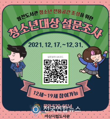 전국연합뉴스 노윤호 기자 | 아산시가 오는 31일까지 관내 청소년을 대상으로 월천도서관 청소년 전용공간 조성을 위한 설문조사를 실시한다.