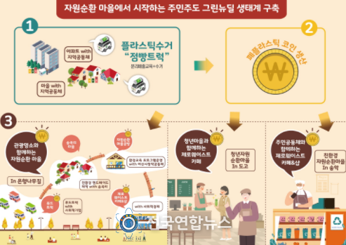 아산시는 사회적경제 조직들이 함께 힘을 모아 폐플라스틱 사용량을 감축하는 순환 경제를 구축하는 사업계획으로 공모사업에 최종 선정됐다. 사업계획에 따르면 우선 마을공동체에서 50개 시민 수거 거점을 전기 트럭으로 순회하며 양질의 폐플라스틱을 수거한다. 수거된 폐플라스틱을 소재로 코인 화폐를 만들고 이를 수거 보상으로 나눠 준다. 코인 화폐는 3개의 자원순환 마을에서 진짜 화폐처럼 사용한다.