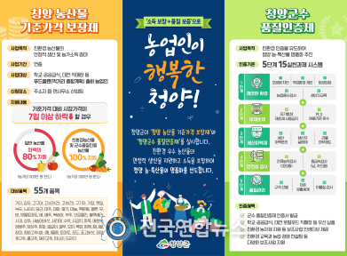 전국연합뉴스 노윤호 기자 | 청양군이 내년 1월부터 농산물 기준가격 보장대상 품목을 55종으로 확대하고, 올해 3차 보상금으로 농가 133곳에 1,900만 원을 지급한다.