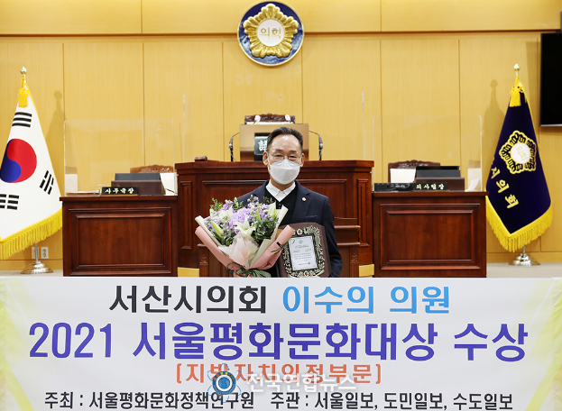 전국연합뉴스 노윤호 기자 | 서산시의회 이수의 의원(부석·해미·고북)이 서울평화문화정책연구원이 주관하는 ‘2021 서울평화문화대상’에서 문화재 발전을 위해 가장 우수한 활동을 한 기초의원으로 선정됐다.