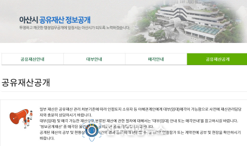 전국연합뉴스 노윤호 기자 | 아산시는 지난 22일 시민의 알권리를 충족과 공유재산 대부율 증대를 위해 일반재산 운용현황을 시 홈페이지에 공개했다고 밝혔다.