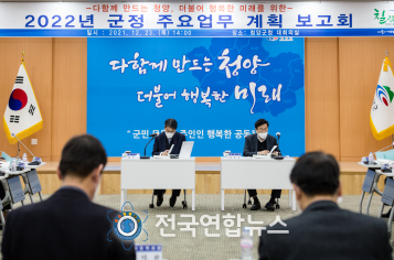 전국연합뉴스 노윤호 기자 | 청양군이 지난 23일 군청 대회의실에서 김돈곤 군수와 부서장이 참석한 가운데 2022년 주요 업무계획 보고회를 열고 군민 행복을 위한 행정 의지를 다졌다.