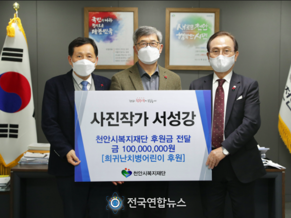 전국연합뉴스 노윤호 기자 | 천안시와 천안시복지재단은 지난 24일 서성강 작가가 천안시청에서 희소 난치병으로 고통받는 어린이지원을 위한 1억 원 후원금을 기부하고 아너소사이어티에 가입했다고 27일 밝혔다.