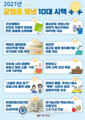 부여군은 27일 이러한 정책적 노력의 성과를 담아 ‘2021년 군정을 빛낸 10대 시책’을 발표했다.