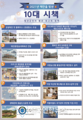 군은 10대 시책 외에도 올해 △어촌뉴딜300 사업 추진 △동학농민혁명기념관 건립 △태안군UV랜드 조성 △영목항 국가어항 개발 △두야-정죽(국지도96호) 4차로 확포장공사 확정 등 각 분야에서 많은 성과가 있었다며, 내년에도 지역 발전을 이끌어갈 다양한 사업 발굴 및 추진에 힘쓰겠다는 각오를 밝혔다.