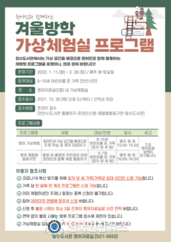 청수도서관은 코로나19 확산 방지를 위해 한 회차 당 세 가족까지만 예약받아 운영할 예정이다. 접수는 12월 30일 오후 2시부터 천안시도서관 누리집에서 할 수 있다.