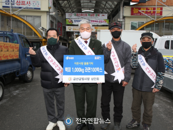 전국연합뉴스 노윤호 기자 | 금산금빛시장 상인회는 지난 28일 금산군에 10kg 쌀 100포, 라면 100박스를 기탁했다.