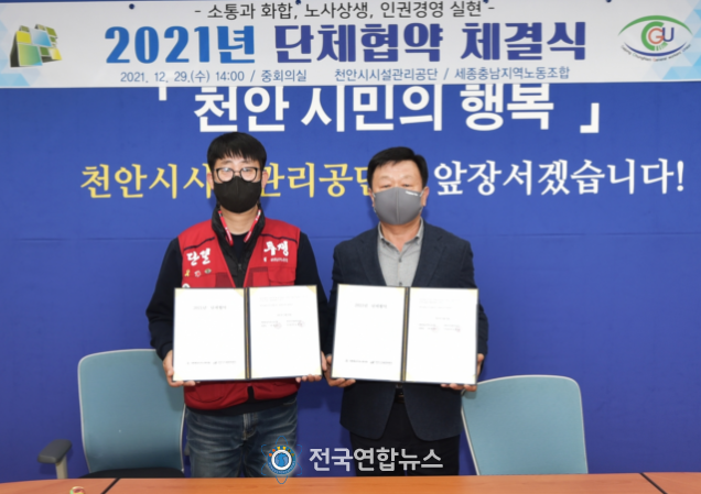 전국연합뉴스 노윤호 기자 | 천안시시설관리공단과 세종충남지역노동조합은 지난 29일 공단 본부 중회의실에서 양측 교섭위원이 참여한 가운데 2021년도 단체협약을 체결했다.