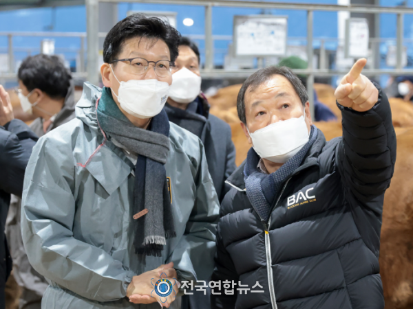 전국연합뉴스 노윤호 기자 | 김정섭 공주시장이 5일 아침 임인년 새해 첫 한우 경매가 열린 공주 가축시장을 방문해 축산인들을 격려했다.