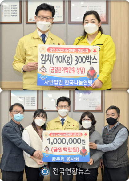 이어 사단법인 한국나눔연맹은 어려운 이웃을 위해 써달라며 김치 300박스(1200만원 상당)를 전달했다.