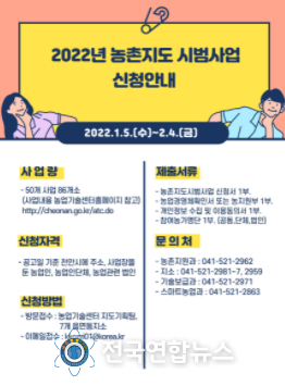 전국연합뉴스 노윤호 기자 | 천안시농업기술센터는 1월 5일부터 2월 4일까지 31일간 지역농업경쟁력 강화 및 현장 중심 농업신기술 보급을 위한 2022년 농촌지도 시범사업을 신청받는다고 밝혔다.