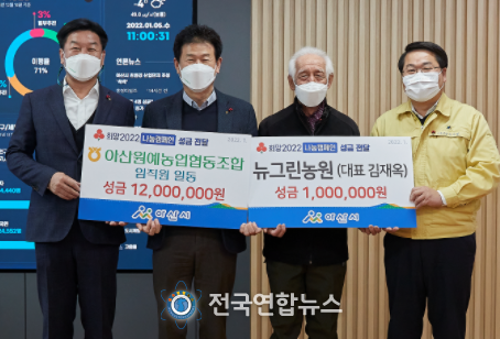 전국연합뉴스 노윤호 기자 | 아산원예농업협동조합과 뉴그린농원이 지난 5일 아산시에 ‘희망2022나눔캠페인’ 성금 1300만원을 전달했다.