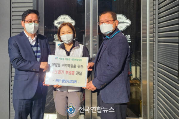 전국연합뉴스 노윤호 기자 | 천안시 봉명동은 황보가(家)코다리 음식점이 6일 취약계층을 위한 후원금 30여만 원을 기탁했다고 밝혔다.