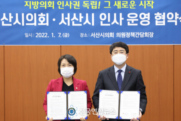시의회는 이연희 서산시의회 의장과 맹정호 서산시장이 7일 시의회 정책간담회장에서 이 같은 내용이 담긴 인사운영 협약을 체결했다고 밝혔다.
