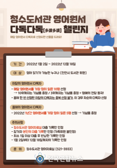 전국연합뉴스 노윤호 기자 | 천안시 청수도서관이 1월부터 12월까지 올해 1년간 영어원서 ‘다독다독(多讀多讀) 챌린지’를 운영한다.