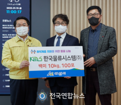 전국연합뉴스 노윤호 기자 | 한국물류시스템(주)가 지난 10일 아산시를 방문해 지역 내 취약계층을 돕기 위한 325만원 상당 백미 10kg 100포를 후원했다.
