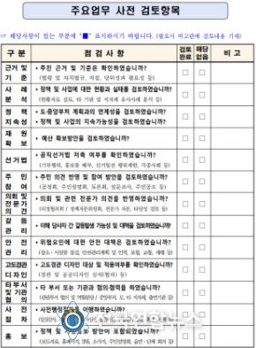 이 제도는 신규사업 및 중요사업 등 주요정책 입안 중 발생하는 행정착오를 예방하기 위해 계획수립단계 시 ▲근거 및 기준 ▲사례분석 ▲정책 지속성 ▲재원 확보 ▲공직선거법 ▲주민참여 ▲의회 및 전문가 의견 ▲갈등관리 ▲안전관리 ▲고도경관 디자인 ▲타부서 및 기관협의 ▲사전절차 ▲홍보 등 13개 분야에 대해 기안자가 사전 검토해 체크리스트를 작성하고 지속 관리하기 위해 마련됐다.