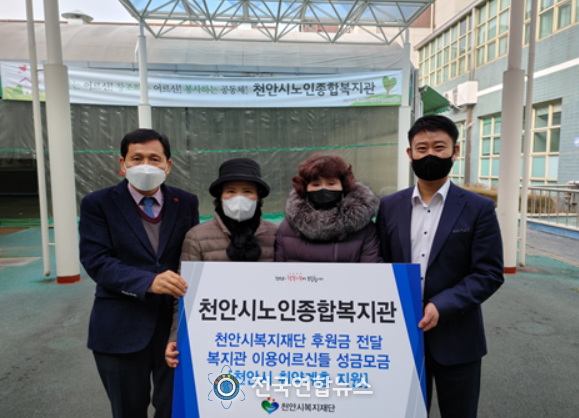 전국연합뉴스 노윤호 기자 | 천안시노인종합복지관 은빛봉사단 어르신들이 지난 연말 복지관 관내에서 취약계층을 위한 후원금 모금 활동을 펼쳐 모아진 모금액을 천안시복지재단에 10일 전달했다.