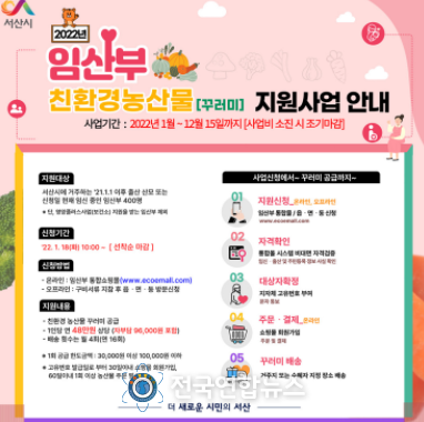 사업 신청은 오는 18일 오전 10시부터 400명 선착순 접수하며, 임산부 친환경농산물 전용 쇼핑몰인증 통해 신청하면 된다.