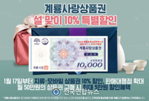 전국연합뉴스 노윤호 기자 | 계룡시는 설 명절을 앞두고 코로나19 등으로 어려움을 겪고 있는 소상공인 보호 및 지역경제 활성화를 위해 오는 17일부터 ‘계룡사랑상품권’을 10% 할인된 가격으로 판매한다고 밝혔다.