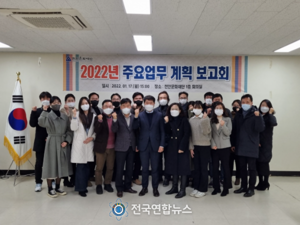전국연합뉴스 노윤호 기자 | 천안문화재단은 지난 17일 재단 회의실에서 코로나19로 위축된 시민들의 삶을 문화예술로 위로하고 활력을 선사하기 위해 ‘2022년 주요업무 계획’ 보고회를 열고 변화와 도약의 새로운 한 해를 다짐했다.