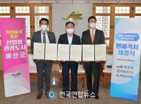 전국연합뉴스 노윤호 기자 | 예산군은 지난 18일 ㈜산업단지닷컴 및 현대엔지니어링(주)와 예산읍 간양리 일원에 조성될 예산 케이바이오 융복합단지의 성공적 조성을 위해 양해각서를 체결했다.