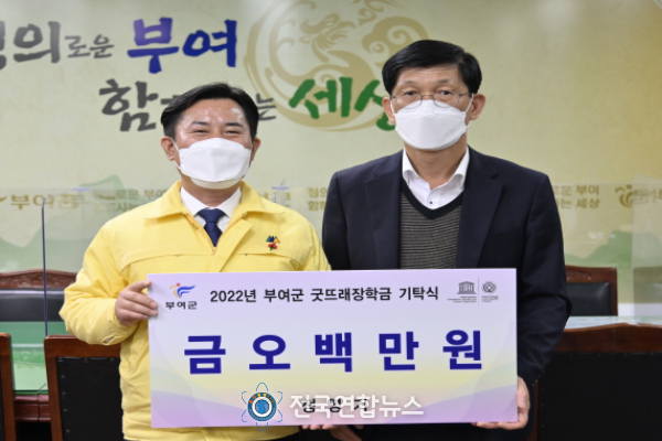 전국연합뉴스 노윤호 기자 | 정영기 충남도 감사위원회 전 사무관이 지난 19일 부여군청을 찾아 향토인재 육성에 사용해달라며 장학금 500만 원을 부여군굿뜨래장학회에 기탁했다.