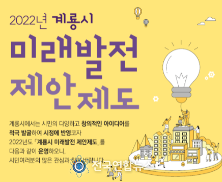 전국연합뉴스 노윤호 기자 | 계룡시는 시민의 다양하고 창의적인 아이디어를 적극 발굴하여 시정에 반영하기 위한 ‘계룡시 미래발전 시민제안제도’를 운영한다고 밝혔다.