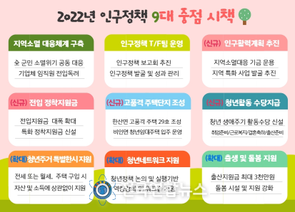 이외에도 인구정책의 실행력 담보와 5만 인구 사수를 위해 인구정책 TF 점검회의를 지속적으로 개최하고 청년층 정책참여를 위한 청년네트워크 운영을 통해 전 군민과 함께 지역문제를 해결하는 사회적 논의시스템을 강화할 예정이다.