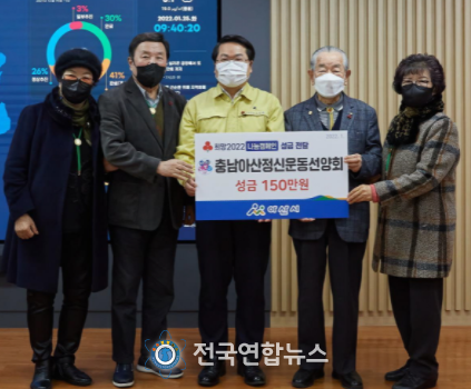 전국연합뉴스 노윤호 기자 | 충남아산정신운동선양회가 지난 25일 아산시에 방문해 취약계층 지원을 위한 성금 150만원을 전달했다.