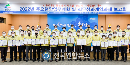 전국연합뉴스 노윤호 기자 | 김돈곤 청양군수와 청양군청 소속 5급 이상 간부 공무원들이 지난 25일 직무성과 계약을 맺고 군민 행복을 위한 업무 추진에 전력을 다하기로 약속했다.