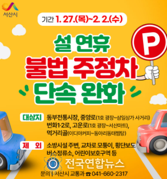 전국연합뉴스 노윤호 기자 | 충남 서산시가 설 명절을 맞아 1주간 전통시장 주변 주정차 단속을 유예한다.