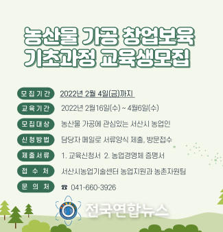 전국연합뉴스 노윤호 기자 | 충남 서산시가 2월 4일까지 농산물 가공 창업보육 기초과정 교육생을 모집한다.
