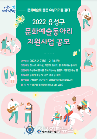 전국통합뉴스 이아롱 기자 | 대전 유성구는 지역에서 활동하는 청소년·대학생·직장인·일반인 문화예술동아리를 대상으로 18일까지 ‘2022년 문화예술동아리 지원사업’을 신청·접수한다고 9일 밝혔다.