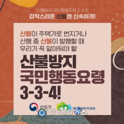 산불이 주택가로 번지거나 산행 중 산불이 발행할 때, 우리가 꼭 알아둬야 할 산불방지 국민행동요령 3-3-4!
