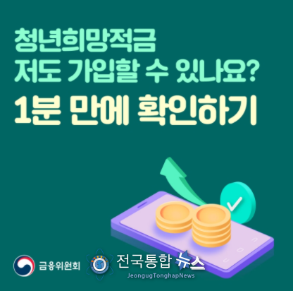 전국통합뉴스 이종구 기자 | 청년희망적금을 취급하는 11개 은행의 앱(App)에서 확인하고, 가입가능 여부를 문자로 받아보세요!