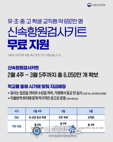 전국통합뉴스 이종구 기자 | 유·초·중·고 학생·교직원 약 692만 명에 신속항원검사키트를 무료 지원합니다.