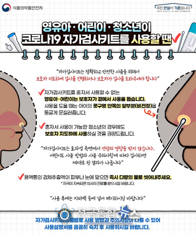 전국통합뉴스 이종구 기자 | 자가검사키트는 정확하고 안전한 사용을 위해서 보호자 지도하에 검사를 진행하거나 보호자가 검사를 도와주셔야 합니다.