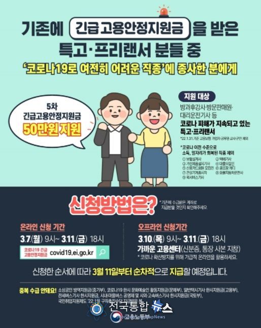 전국통합뉴스 이종구 기자 | 기존에 긴급고용안정지원금을 받은 특고·프리랜서 분들 중 ‘코로나19로 여전히 어려운 직종’에 종사한 분에게 5차 긴급고용안정지원금 50만원을 지원합니다!