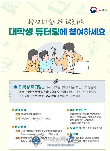 대학생 튜터링은 코로나19 장기화에 따른 초·중·고 학생들의 학습, 심리·정서적 결손을 회복하기 위해 예비교사인 교·사대생 등 대학생들이 학습보충, 상담 등을 지원하는 사업입니다.