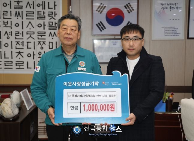 19일 군에 따르면, ㈜플레이메이커엔터테인먼트는 군청 군수실에서 가세로 군수와 정재우 대표 등이 참석한 가운데 기탁식을 갖고 성금 100만 원을 군에 기탁했다.