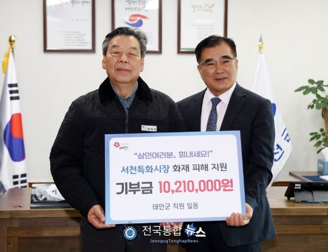 군에 따르면, 2월 16일부터 19일까지 진행된 이번 성금 모금에는 가 군수를 포함한 태안군 공직자 671명이 자발적으로 참여했으며, 성금은 충남사회복지공동모금회에 전달돼 시장 상인들의 피해 복구에 쓰일 예정이다.