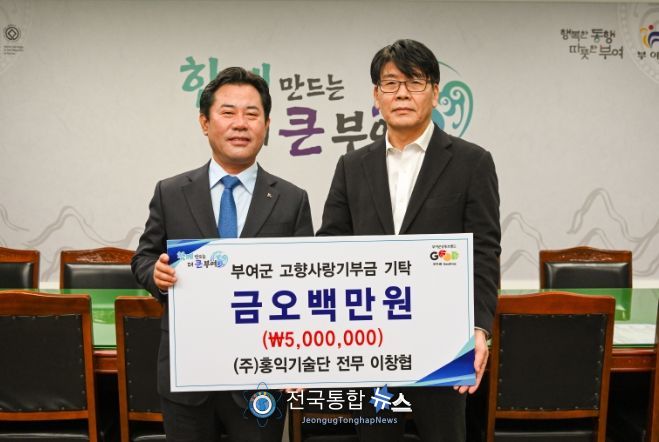 전국통합뉴스 이인복 기자 | 부여군은 지난 12일 ㈜홍익기술단 이창협 전무가 고향사랑기부금 500만 원을 기탁했다고 밝혔다. 이는 올해 두 번째 최고액 기부로 연초부터 이어지는 고액 기부 행렬로 고향사랑기부에 순풍이 불고 있다.