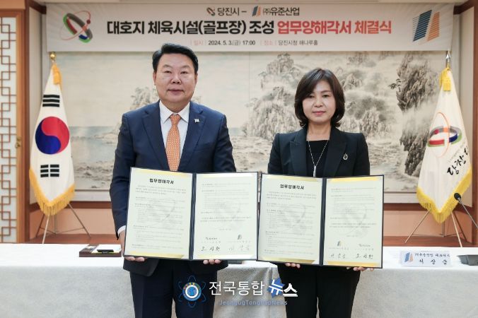 이날 협약은 ㈜유준산업이 약 1,500억 원을 투자해, 당진시 대호지면 일대 50만평 부지에 조성할 예정인 체육시설(골프장)의 원활한 추진을 위해 진행됐다.