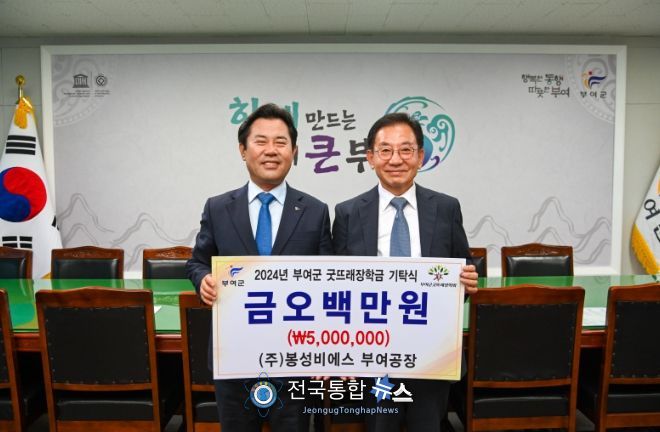 전국통합뉴스 이인복 기자 | 주식회사 봉성비에스 부여공장은 지난 10일에 부여군청을 방문하여 지역 향토인재 육성을 위한 장학금 500만 원을 (재)부여군굿뜨래장학회에 기탁했다.