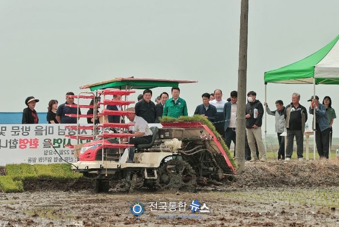 전국통합뉴스 이인복 기자 | 오성환 당진시장이 22일 신평면 신흥리 이병섭 농가에서 지역주민과 농협 관계자 등 30여 명이 참석한 가운데 풍년 농사를 기원하는 모내기를 시연했다.