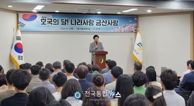 전국통합뉴스 이인복 기자 | 박범인 금산군수는 3일 군청 다목적회의실에서 열린 월례회의에서 “직원들 간 서로 사랑과 존경으로 인화하는 마음을 갖자”고 말했다.